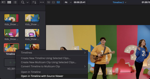 剪辑模式可以为您智能同步片段和剪辑,无需在时间线上放置入点,有效节省时间。